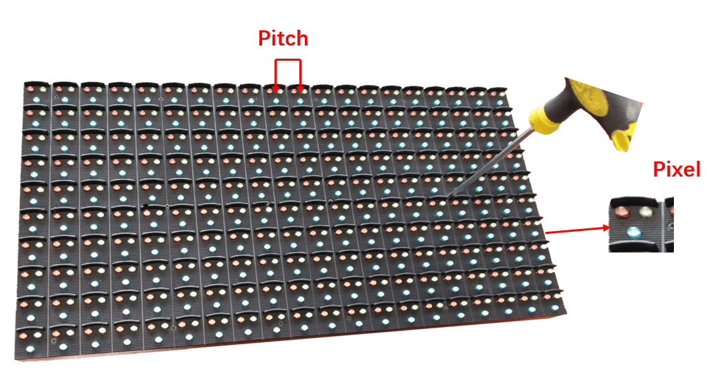 Pixel là cụm nhỏ nhất của mô-đun LED hoặc hình ảnh màn hình LED, mỗi cụm bao gồm đèn LED 3 màu, một màu đỏ, một màu lục và một màu xanh lam, biểu thị một pixel